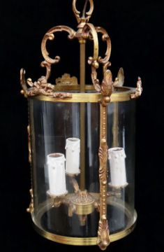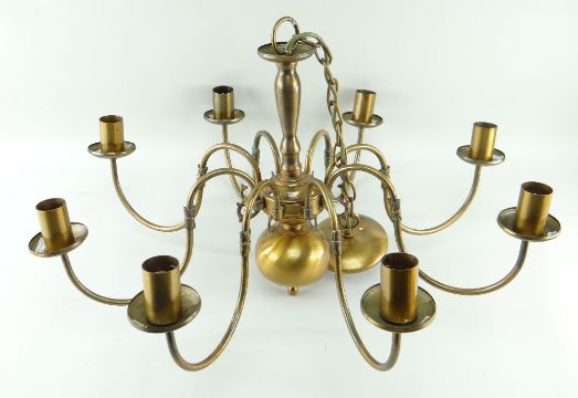 ASSORTED GILT METAL LIGHTING, including a three-light hall lantern, 44cms high, French style five-branch ceiling light, 49ms high, Dutch-style eight-branch ceiling light, 74cms diameter, and two others (6)