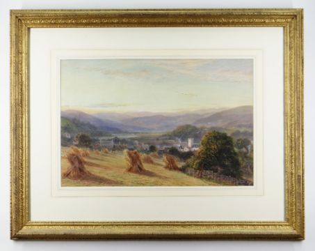 ARTHUR HENRY ENOCH (1839-1917) watercolour - View of Dolgellau with hayricks in the foreground, signed and dated 1883, 34 x 52cms