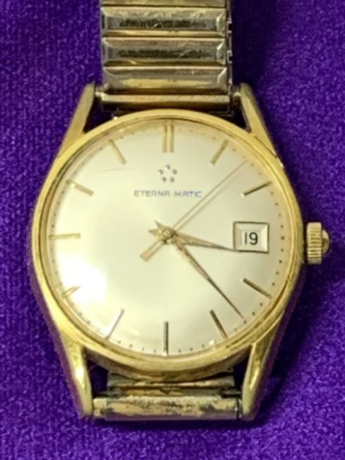 ETERNA-.MATIC GOLD PLATED CALENDAR GENT'S WRISTWATCH, champagne dial with baton markers, stainless steel case back numbered 4999147 and inscribed 'G T Roberts with affection from his friends in Stamford 1967' on a non-matching expanding bracelet with original box and certificate of origin along with two service/repair papers for 1988 and 1993, watch purchase date to the back of the certificate 18/7/67, appears in working order when listed