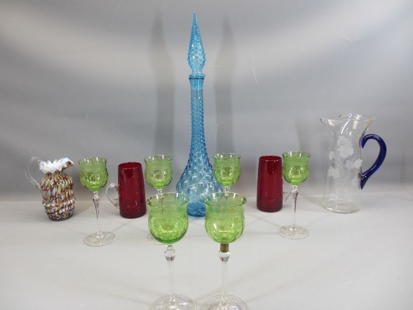 ART GLASS - bobble type lidded decanter, two jugs and a set of six antique style hock glasses, ETC