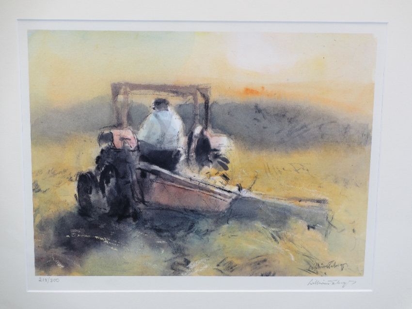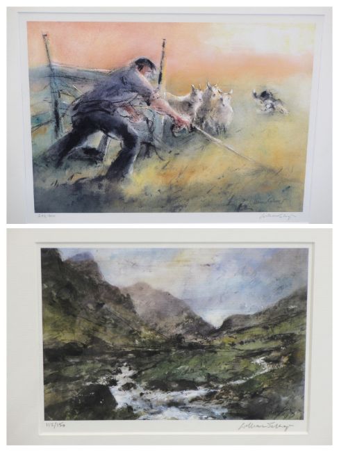 WILLIAM SELWYN limited edition prints (2) 292/300 - a farmer with a sheep dog herding sheep, 32.5 x 42.5cms and 112/150 - Snowdonia scene, 14.5 x 20cms, both signed in pencil, mounted but unframed