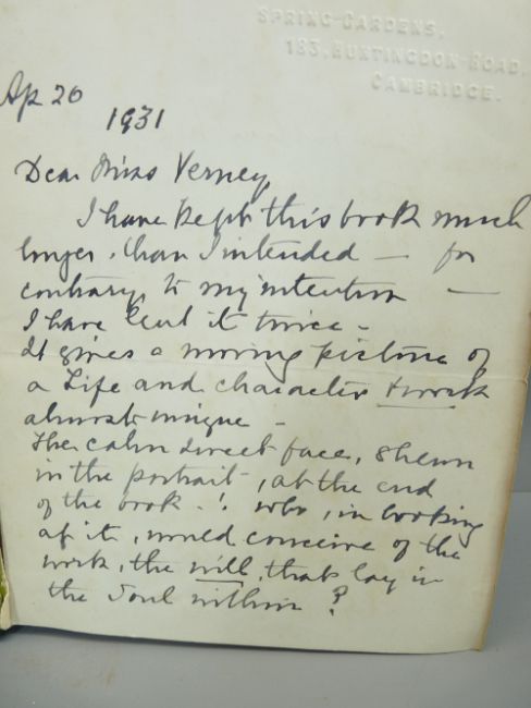 FLORENCE NIGHTINGALE INTEREST BOOKS (3) PLUS ONE OTHER - titles include 'Queen Elizabeth', E S Beesly, Macmillan & Co London and New York 1892, inscribed to the interior 'Ruth from Aunt Florence Christmas 1892', 'Jesus the carpenter of Nazareth' by Robert Bird, 9th edition, Keegan Paul, Trench, Trubner & Co Ltd, London 1894 inscribed to the interior 'Ruth Florence Verney from Aunt Florence January 1895', 'The Fishers of Derby Haven' by Hesba Stretton, 'The Religious Tract Society London' inscribed to the interior 'Ruth from Aunt Florence' and 'A Lost Commander Florence Nightingale' by Mary Raymond Shipman Andrews, Double Day, Doran & Company Garden City New York 1929, ownership written Ruth Florence Verney October 7 1930 containing tipped in newspaper cuttings to the front blanks and front cover verso about her godmother along with a handwritten letter dated April 20 1931, 'Dear Miss Verney, I have kept this book much longer than I intended etc' signed Mrs Sturge