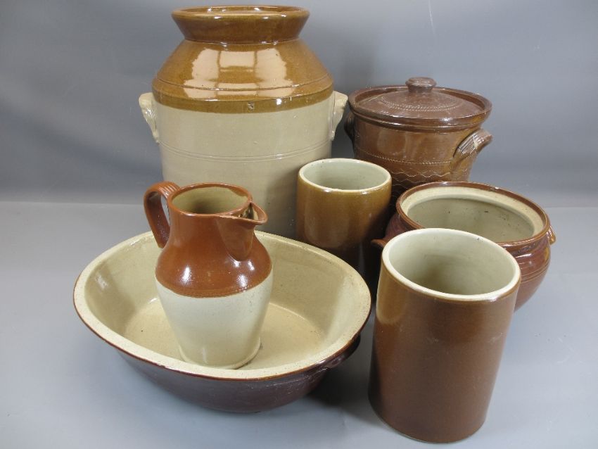 EARTHENWARE GLAZED TWIN-HANDLED LIDDED CONTAINER - 37.5cms tall, similar items including multi-footed food server, jugs, provision containers, ETC