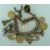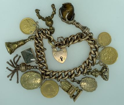 9CT GOLD CHARM BRACELET WITH 15CT GOLD PADLOCK CLASP & 13 CHARMS including a folded up one pound note in 9ct gold box inscribed 'In emergency break glass', 9ct gold stamped tassel, Edward VII 1910 half gold sovereign, unmarked gilt metal locket with Greek key enamel decoration to the front and chase decorated detail verso, gilt metal monogram seal throne stamped 'RD386179', unmarked gilt metal locket, foliate engraved with vacant shield shape cartouche to the front, monogrammed hardstone gilt metal seal, George V 1914 gold half sovereign, 1873 gold one dollar, unmarked gilt metal claw holding tiger's eye bowl, gilt metal swivel fob mount (lacking fob), 1878 gold 2½ dollar and a gilt metal swivel fob set with an amber coloured stone, 85.5grms gross