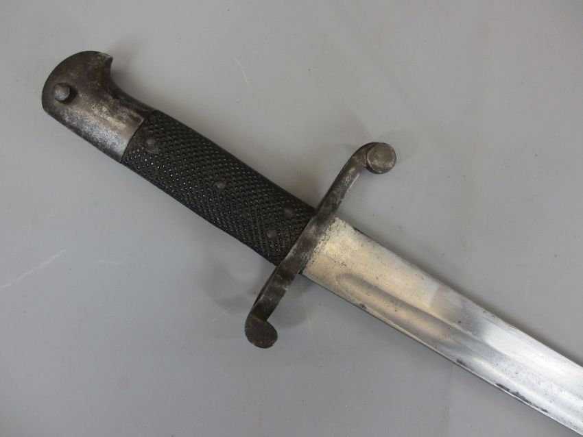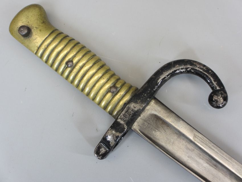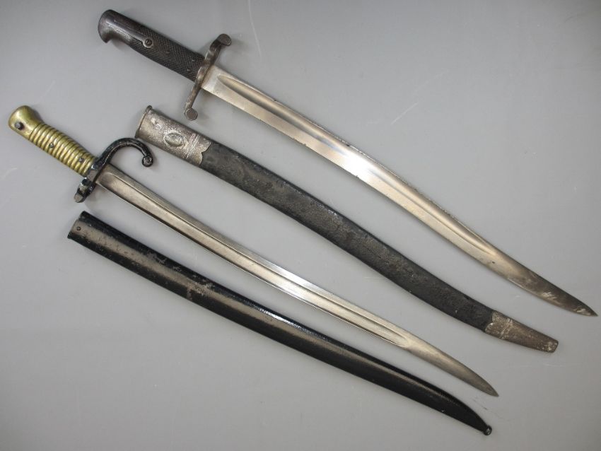SWORD BAYONETS (2) to include a French M1866 Chassepot with metal scabbard, 22.5in blade L, 71cms overall L fully sheathed, guard and scabbard over painted, indistinct date mark, brass grip and an 1858 pattern Yataghan in metal mounted leather scabbard, 22.5in blade, 72cms overall L fully sheathed, no markings, hatched grip