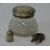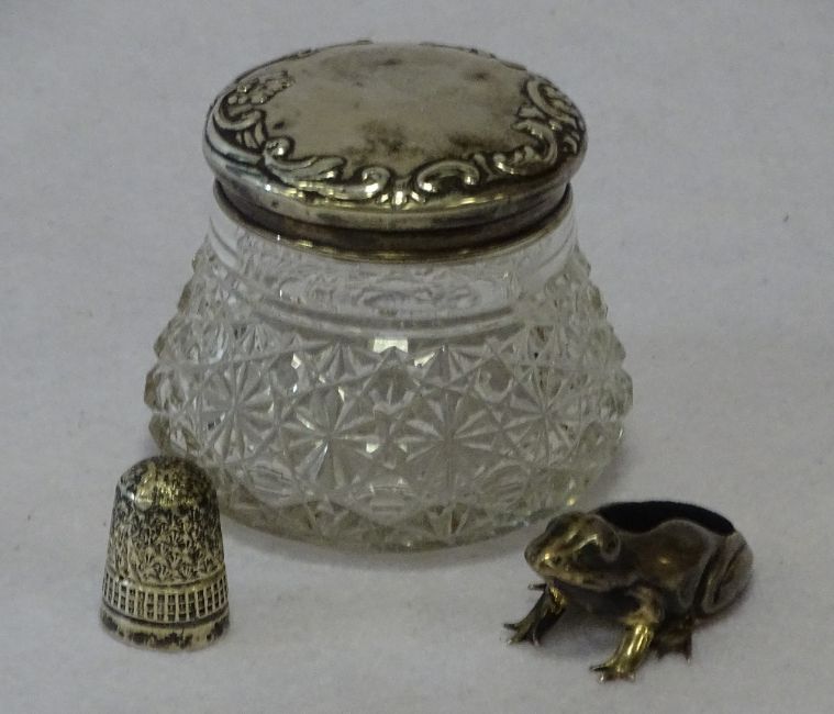 SILVER - SMALL, 3 ITEMS to include a silver topped glass trinket jar, Chester 1901, silver thimble possibly Charles Horner 1899 and a novelty pin cushion in the form of a frog stamped '925', 5cms L