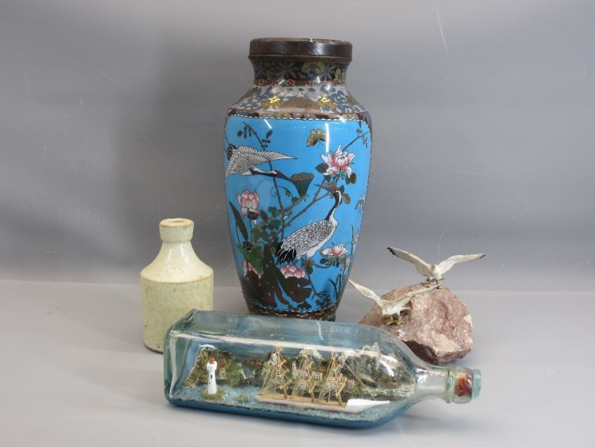 CLOISONNE VASE - 31cms tall plus a wooden lamp fitting, ornamental ship in a bottle, mineral ornament of gulls on a rock and an old ink well