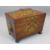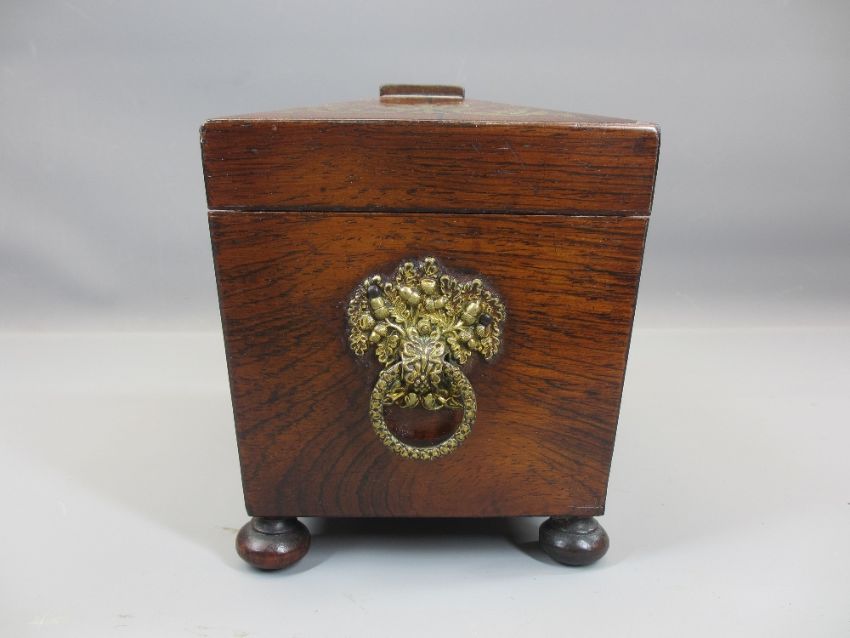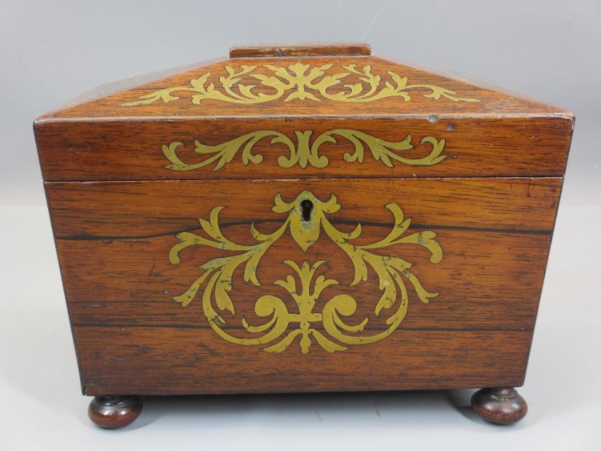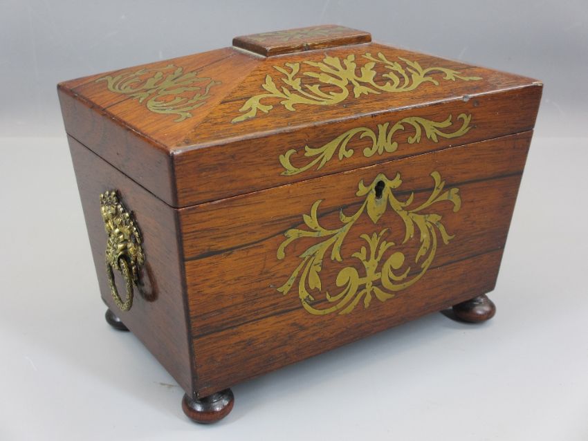 19TH CENTURY BRASS INLAID ROSEWOOD TEA CADDY having twin interior lidded compartments, the lids with ivory knops, side carry handles in brass embossed with acorn and oak leaf decoration with ring handles on turned bun feet, 16.5cms H, 20.25cms W, 12.75cms D