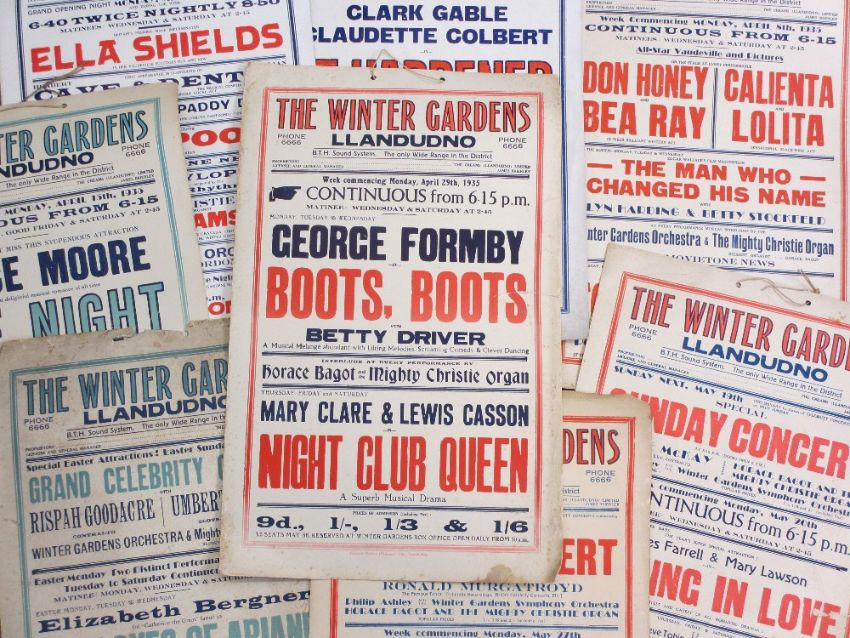 THE WINTER GARDENS LLANDUDNO ORIGINAL 1930s BILLBOARD POSTERS - Artists include: George Formby 'Boots, Boots', Clark Gable and Claudette Colbert in 'It happened one night', Grace Moore in the most delightful musical romance of all time 'One night of love' with Tullio Carminati, ETC