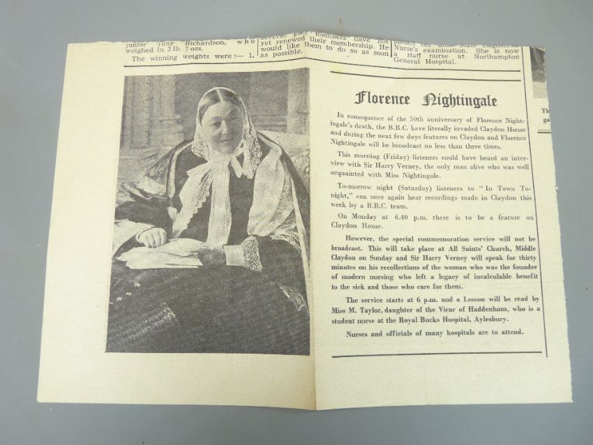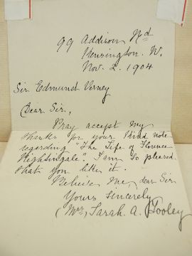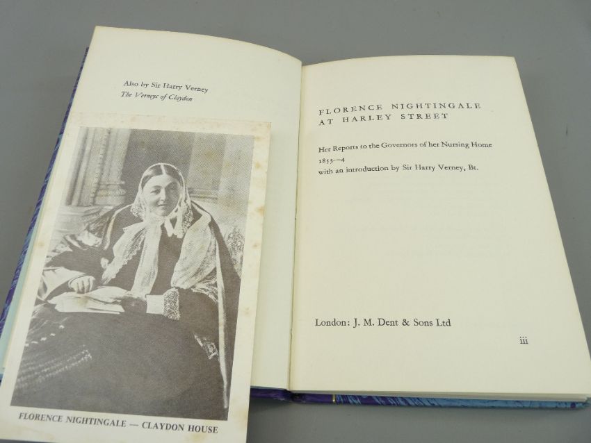 FLORENCE NIGHTINGALE BOOKS - various titles formally owned by her goddaughter Ruth Florence Verney, titles include 'Florence Nightingale 1820 - 1856', I B O'Malley a study of her life down to the end of the Crimean War, Thornton Butterworth Ltd London written ownership detail Christmas 1931, 'The Life of Florence Nightingale' Sara Tooley, S H Bousfield & Co Ltd London 1904, tipped in letter to the interior addressed to Sir Edmund Verney dated November 2 1904 from the author, 'Florence Nightingale' by Cecil Woodham Smith, second printings, two copies with illustrations, Constable London September 1950, one having a photograph to the interior and written detail for Florence Nightingale taken at Claydon House about 1894, the other having tatty dust jacket, 'The Life of Florence Nightingale' E T Cook volumes 1 and 2 1820-1861, 1862-1910, volume 1 inscribed to the plain leaf 'To Florence Nightingale's godchild Ruth Florence Verney 1913', MacMillan & Co Ltd London, the second inscribed 'Ruth Florence Verney Plas Rhoscolyn', 'Florence Nightingale' by Elspeth Huxley, Weidenfald & Nicolson London 1975, 'Is that lamp going out' by the author of 'Where's Master', Hodder & Stoughton 1910, 'The History of Nursing in the British Empire', Sara Tooley with 57 illustrations, S, S H Bousfield & Co Ltd London 1906, 'Hospital Sketches' Louisa M Alcott author of Little Women, with illustrations, Little, Brown & Company Boston 1898, 'Florence Nightingale at Harley Street, Her Reports to the Governors of Her Nursing Home 1853-4' by Sir Harry Verney, J M Dent & Sons Ltd London First Edition 1970 and a booklet by the same author, some personal reminiscences about Florence Nightingale given at the Royal Buckinghamshire Hospital Aylesbury on Wednesday 4th October 1967 along with a letter to the interior dated 15th August 1960, typed explaining how the BBC had become interested in Florence Nightingale and the line 'F N used to object to 'The Buz Fuz' about my name' and she would have hated it but what a great woman she was