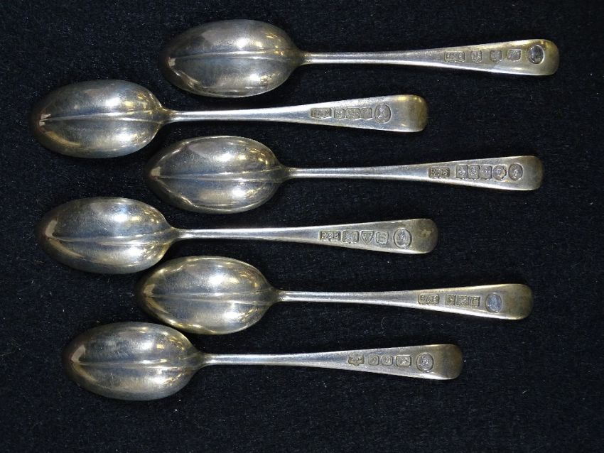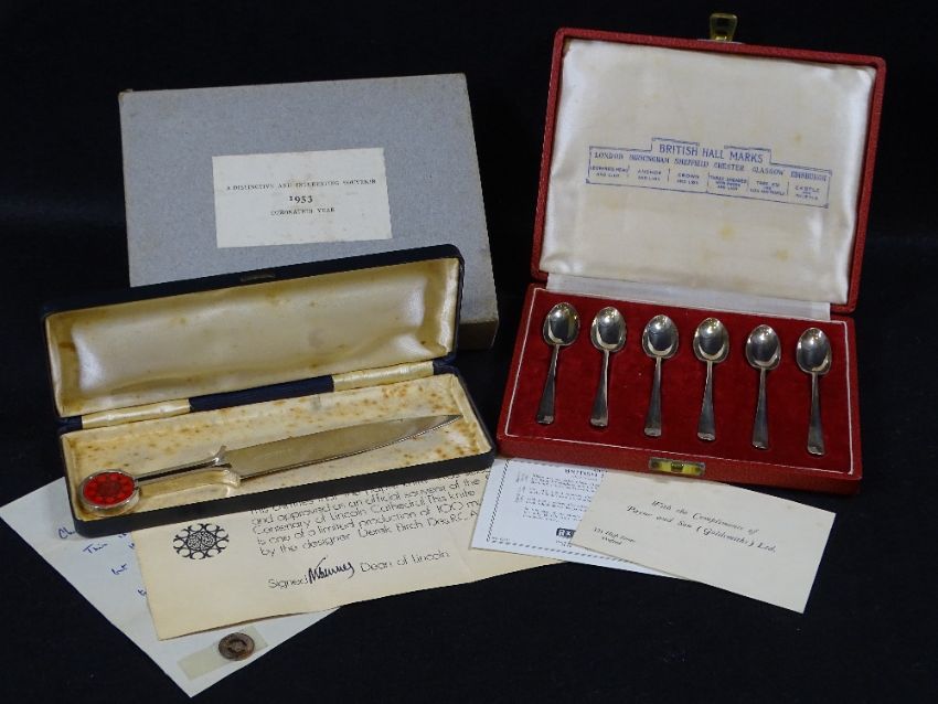 SILVER CASED SET OF BRITISH HALLMARKS TEASPOONS and a limited edition Lincoln Cathedral paper knife, the spoons with six various assay office marks 1953, the paper knife Birmingham 1972 with certificate numbered 8/100, designed by Derek Birch, 5.7ozt gross, the spoons in 'rats tail' design