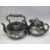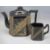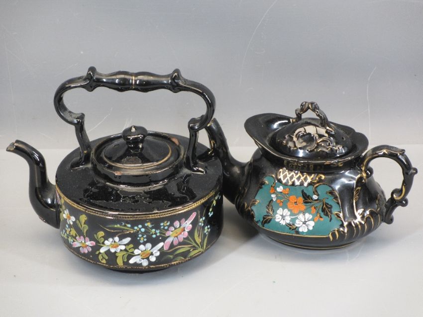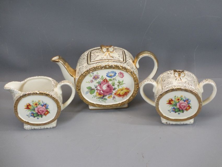 SADLER ROSE DECORATED THREE PIECE TEASET, Jackfield type teapots and a stoneware hot water bottle