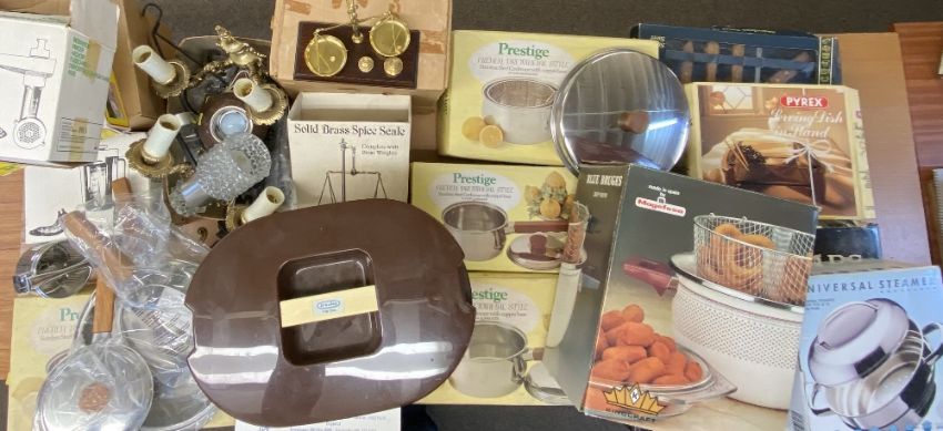 KITCHEN AND HOUSEHOLD- mid century type "Insulex tray box", boxed (appear as new) "Prestige" pans, Kenwood accessories, brass spice scales etc