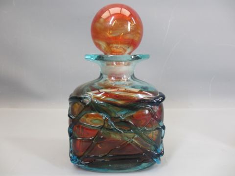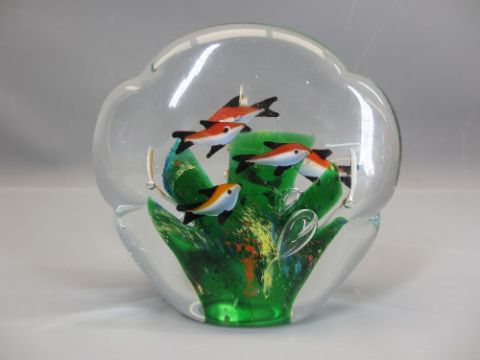 MDINA SIGNED DECANTER & STOPPER 20cms H with Murano ?? style aquarium fish paper weight, 12cms H