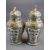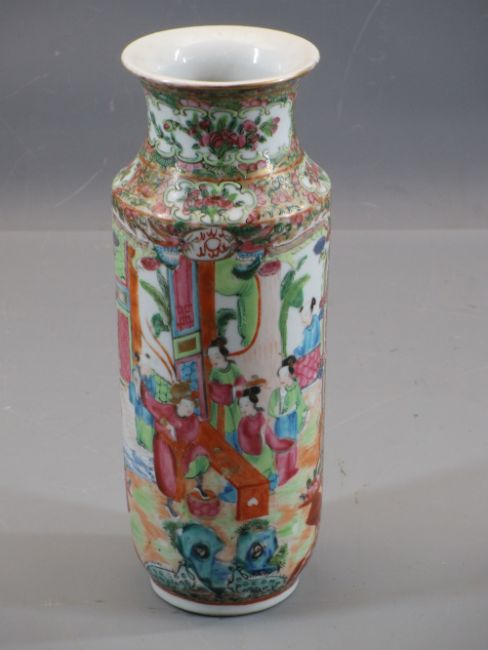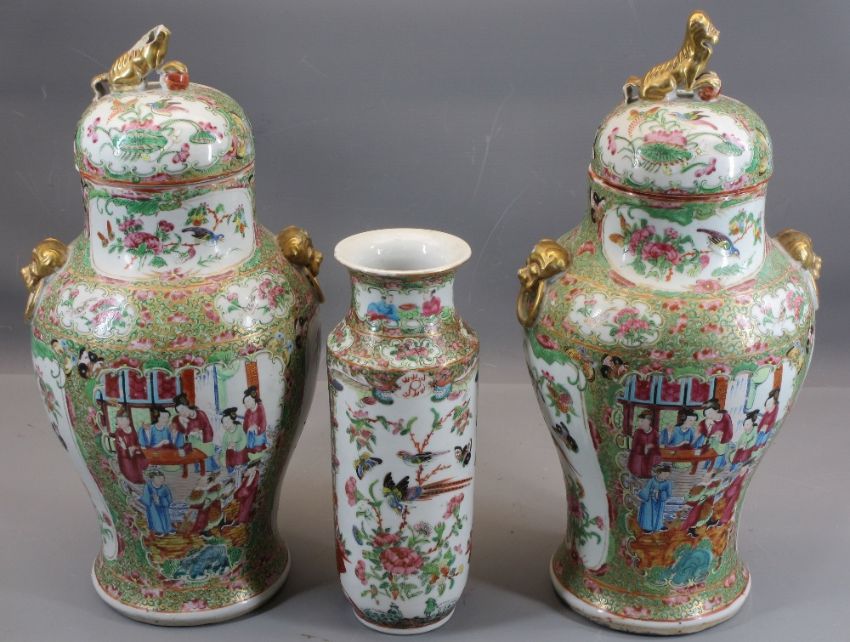 LATE 19TH CENTURY CHINESE CANTON DECORATED JARS WITH COVERS and a vase (damages and restorations) Famille Rose interior scene panels with people, 40cms H the largest, 25cms H the single