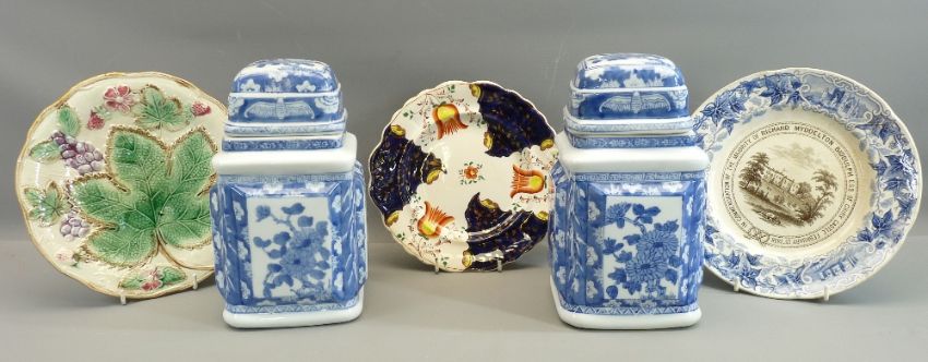 VICTORIAN MAJOLICA LEAF DECORATED PLATE, Victorian commemorative plate for Chirk Castle, a Gaudy Welsh plate and a pair of modern Chinese lidded vases