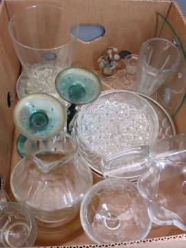 VINTAGE TWIST GLASS CANDLE LUSTRES IN GREEN, cut and other glassware, with a quantity of pottery ornaments, ETC (within 3 boxes)