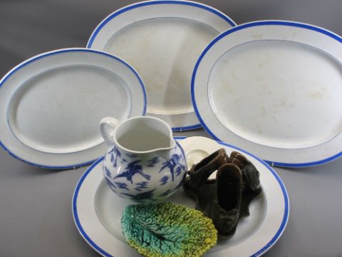 STAFFORDSHIRE MEAT PLATTERS (4) LARGE EXAMPLES, a pair 56cms L and one 59cms L, a Blue & White bulbous jug, a pottery leaf dish and 'Slipper' vase, ETC