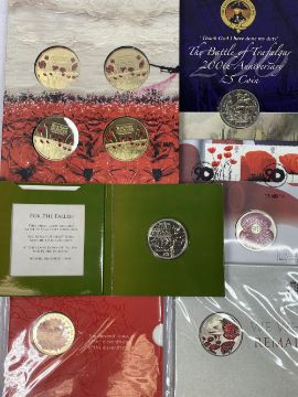 ROYAL MINT SILVER PROOF & OTHER FIRST/SECOND WORLD WAR & RELATED COIN COLLECTION - 20 items to include 2006 silver proof Victoria Cross 50 pence coins, cased, Guernsey 2016 silver proof Battle of the Somme, cased, Royal Mint Poppy commemoratives (5), 2011 coin cover 'Saluting our heroes', Jacqueline Hurley War Poppy Collection, Bailiwick of Jersey 2017, 2018, 2020 £5 coins, Cowell coins 'The Great War', Royal Mint 2005 Centenary £2, Royal British Legion 1981 Diamond Jubilee, First World War Centenary coins (2) and others