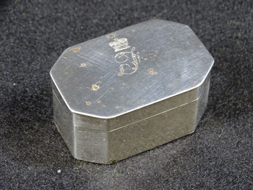 SILVER GEORGE III NUTMEG GRATER, London 1805, maker Thomas Phipps and Edward Robinson, monogram initial with crown over to the lid, 2.2cms H, 4.75cms across