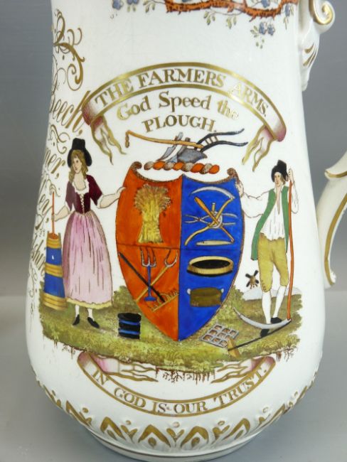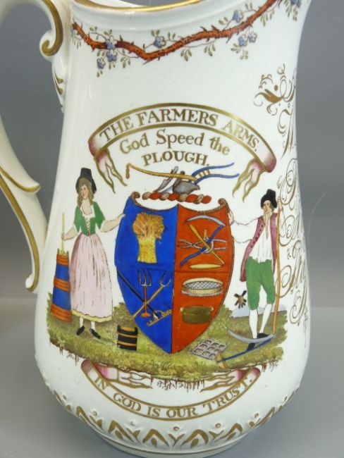 VICTORIAN JUGS - 'The Farmer's Arms. God Speed the Plough in God is our Trust' inscribed for William Beech of Audley, Staffordshire 1857, 25cms tall, also, Staffordshire jug inscribed 'Moses Jennings 1809', 18cms tall