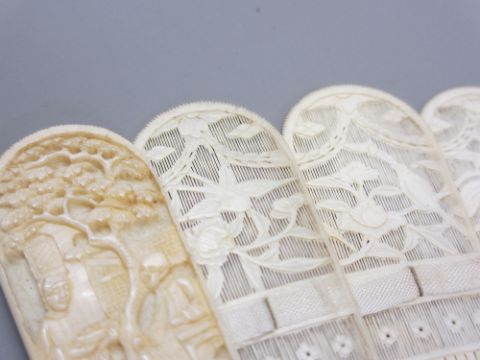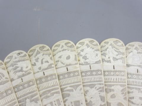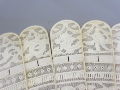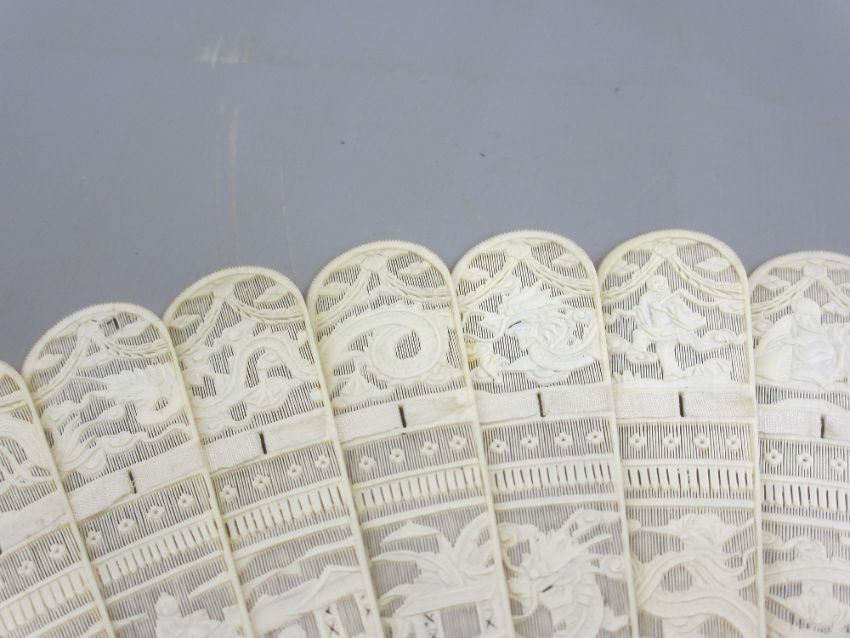19TH CENTURY CARVED IVORY CHINESE CANTON BRISE FAN, the guard sticks decorated with people within a garden setting above writhing dragons along with nineteen individually carved sticks depicting people and pagodas, dragon head detail with swags across the caps, length of guard sticks 19cms