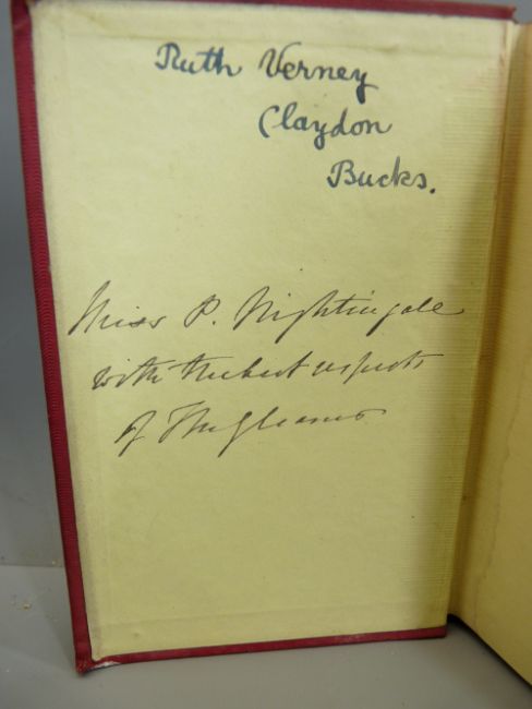 BOOKS OF FLORENCE NIGHTINGALE INTEREST (2) - titles include 'Literary Gleanings by an Invalid' second series to Miss Florence Nightingale the friend of the afflicted, this little volume is by permission respectively and gratefully inscribed by Fanny Henslowe, Simpkin, Marshall & Co London 1857 inscribed in ink front cover verso 'Ruth Verney, Claydon Bucks' and an inscription to 'Miss P Nightingale' believed in Florence's hand with indistinct further text and 'Jackanapes' by Juliana Horatia Ewing, illustrations by Randolph Caldecott, Society for promoting Christian knowledge London (100th thousand) inscribed to the interior 'Harry Verney with Aunt Florence Nightingale's dear love 1890'
