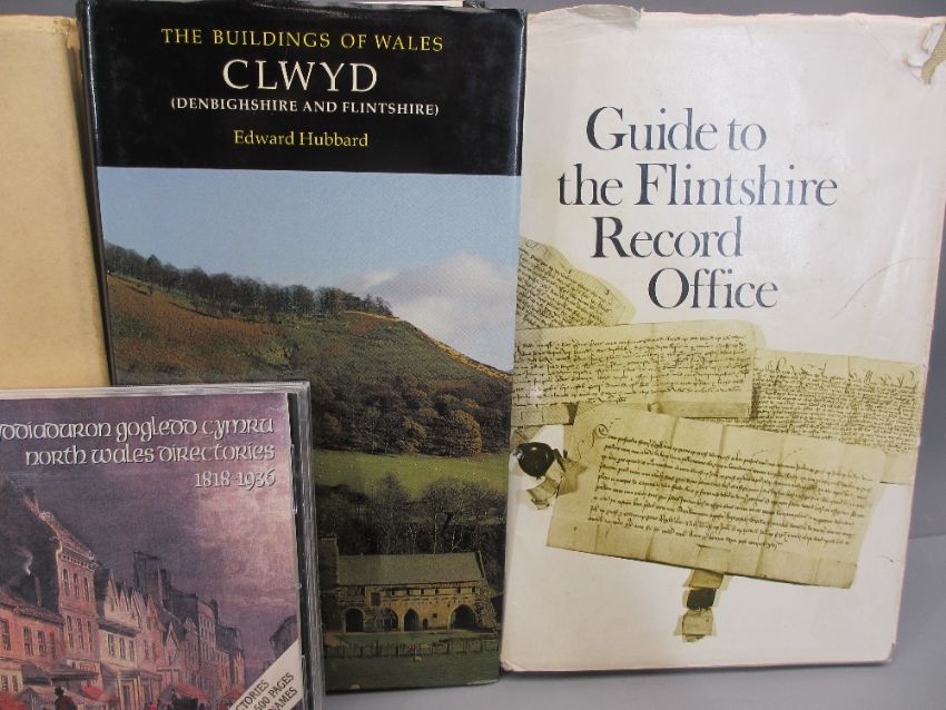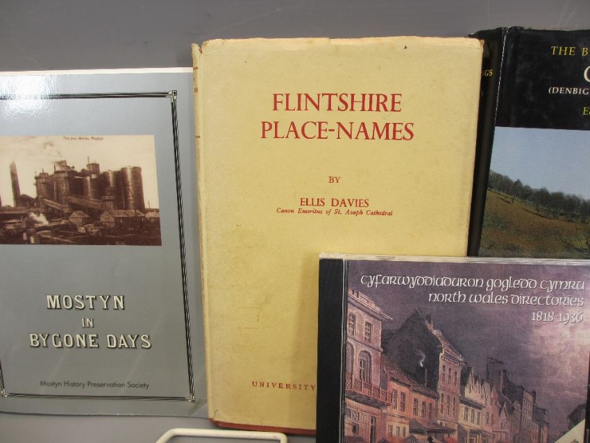 NORTH WALES INTEREST COLLECTORS' BOOKS (12), CD titled 'North Wales Directories' and a vintage Ginger Ale bottle, Andrews & Co Denbigh, book titles include 'A Memoir of Hawarden Parish Flinthsire' containing short introductory notices of the Princes of North Wales by a parishioner, 'Fletcher Chester 1822' pocket and other guides for Ruthin, Mold, Wrexham, Llangollen, 'Wrexham and District Directory August 1907', guides to the Parish records of Clwyd and Flinthsire Record Office, William Ewart Gladstone and Hawarden Castle and village, Ayre and Spottiswoode London 1898, 'The buildings of Wales, Clwyd, Denbighshire and Flintshire' by Edward Hubbard, 'Flintshire place names' by Ellis Davies, University of Wales Press Cardiff 1959 and 'Mostyn in bygone days' second edition Mostyn History Preservation Society