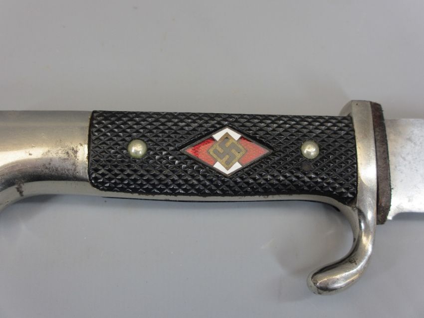 WW2 GERMAN THIRD REICH HITLER YOUTH DAGGER with original metal scabbard, Blut Und Ehre (Blood and Honour) etching and Hartkopf & Co Solingen with Ges.Geschutzt markings to the blade, chequered grip with enamel badge, 24.5cms L, original metal scabbard with leather top clip, blackening very scratched, 25.75cms fully sheathed