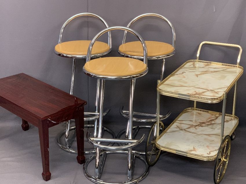 MODERN BAR STOOLS (3), mahogany effect box seat piano stool and a vintage marbled effect drinks wagon, the stools in tubular chrome with light wood circular seats, 94cms H, 40cms diameter