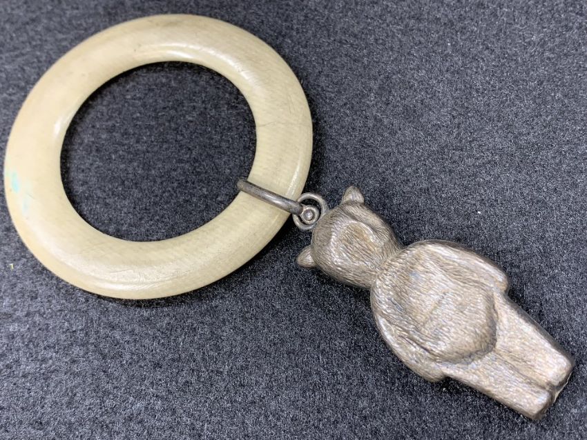 SILVER TEDDY BEAR BABY'S RATTLE WITH TEETHING RING - Birmingham 1933