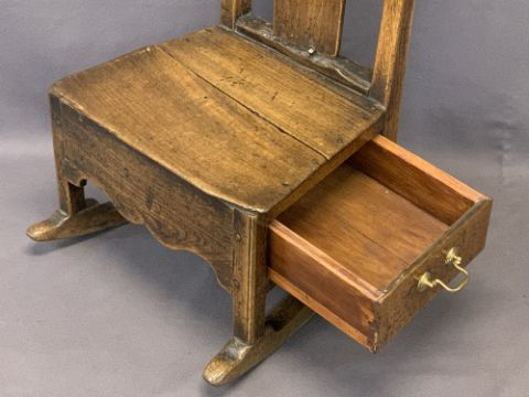 CIRCA 1800 OAK LAMBING CHAIR/ROCKER - the single side drawer with brass swan neck handle, 81cms H, 49cms W, 35cms seat D
