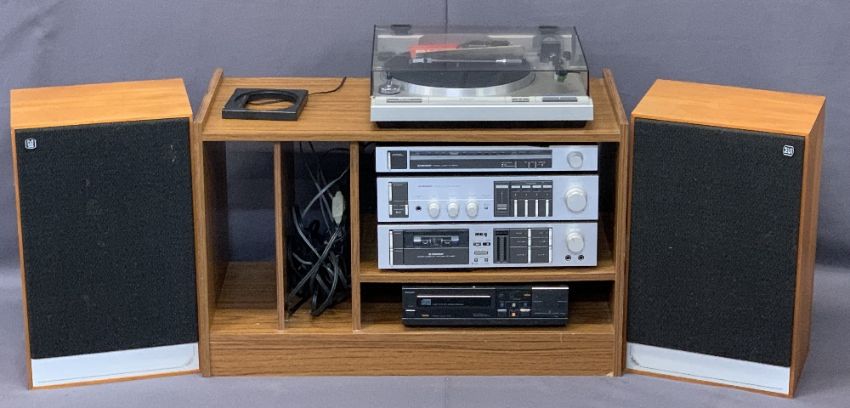 PIONEER HIFI SYSTEM ON TEAK CABINET with a pair of Mordaunt-Short Ltd speakers, PL-340 turntable, TX-540L tuner, BA-540 stereo amplifier, CT-540 stereo cassette deck and a Phillips CD104 compact disc player