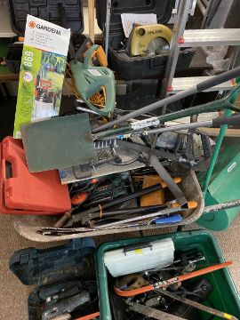 TOOLS ASSORTMENT- to include, BOSCH grinder and sander, other power tool, platforms and ladder, wheelbarrow, roller, long handled garden tools etc, E/T