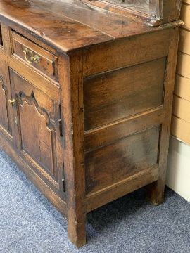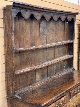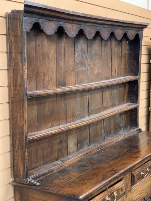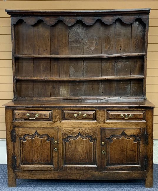GEORGE III MID WALES OAK DRESSER CIRCA 1760 & LATER having a three shelf upper rack with shaped detail to the cornice and iron hanging hooks, rough sawn and replacement wide back boards over a burr oak planked top and peg joined base having three oak lined frieze drawers, shaped chamfered panel cupboard doors and central closed panel on stile feet and panel sides, good colour and patina, replacement brassware circa 1840, interior base boards replaced, 195cms H, 162cms W, 54cms D