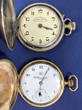 FOUR VINTAGE FULL & HALF HUNTER POCKET WATCHES, silver Albert with T bar and two further chains, the pocket watches all base metal, Railway Timekeeper to the dial on one, other dials marked 'Thomas Russell & Son Liverpool', Westower Lever watch and another marked 'Thomas Russell & Son', the silver Albert stamped to the individual links and T bar