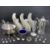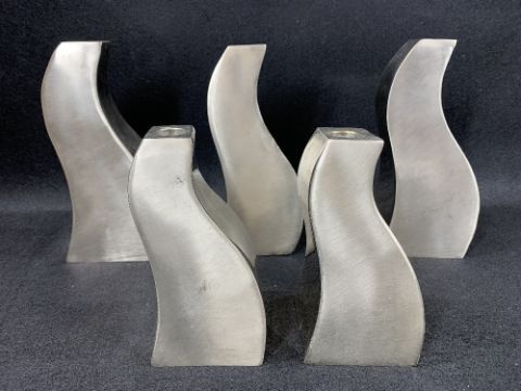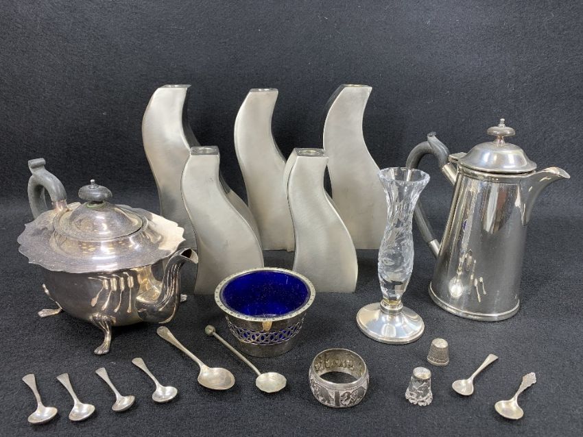 SILVER FOOTED & GLASS TULIP VASE, silver and condiment spoons and thimbles. Also, modern designer white metal candleholders, EPNS teapot and coffee pot
