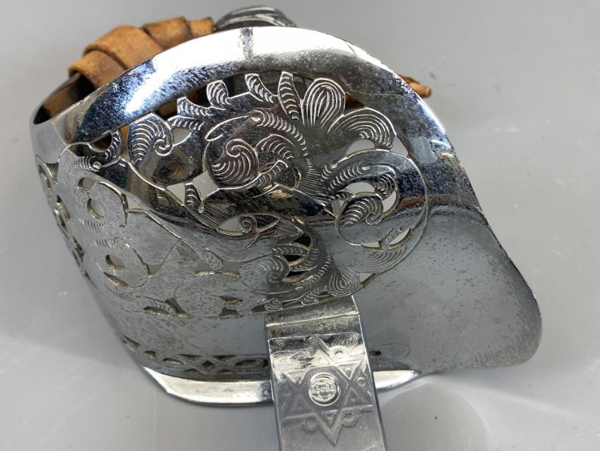 EDWARD VII 1897 PATTERN INDIAN ARMY INFANTRY OFFICER'S SWORD by Robert Mole & Sons Birmingham - in leather scabbard, 82.5cms L, fullered straight blade, 99cms overall fully sheathed, wire bound shagreen grip, the basket hilt with ERI cypher, maker's marks and decorative detail to the blade very worn, blade and possibly the hilt re-chromed, the scabbard probably brown pig skin with leather frog