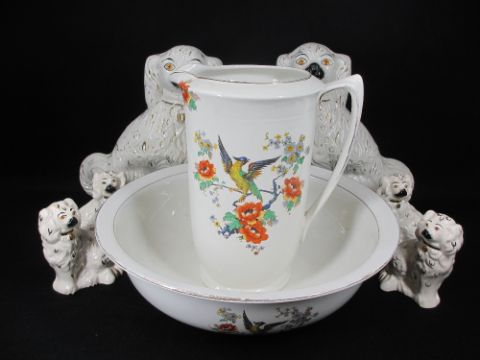 STAFFORDSHIRE POTTERY - a pair of comforter dogs, 34cms H, two other smaller pairs and an exotic bird and floral decorated wash basin and jug set