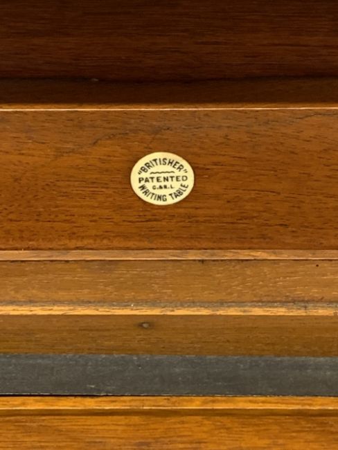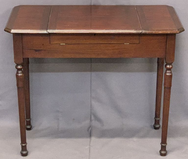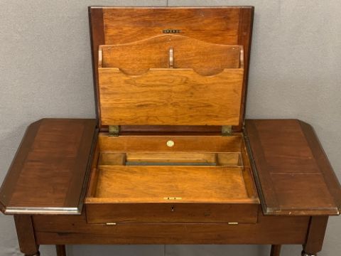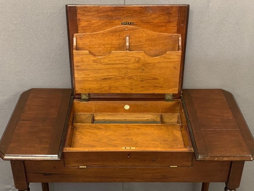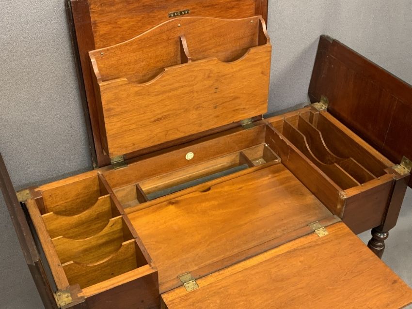BRITISH 'PATENTED' WRITING TABLE IN MAHOGANY having a lift-up centre, fold-up end flaps and fold-out writing surface with interior stationery compartments on turned supports, 76cms H, 91cms W, 45.5cms D closed