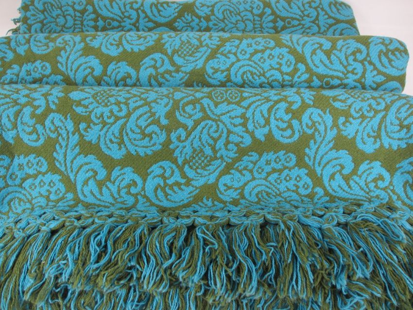 A DAFRA TRADITIONAL BLANKET - in green and blue, 275 x 185cms, with label and tasselled ends