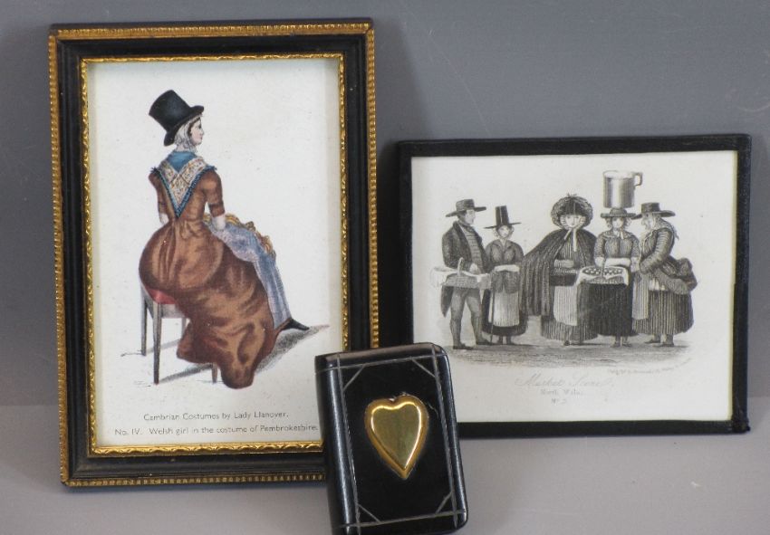 A MODEL OF A BIBLE - in black slate or mineral with a brass heart to 'the cover' and two small, framed prints - market scenes North Wales No 3 and Cambrian costumes by Lady Llanover