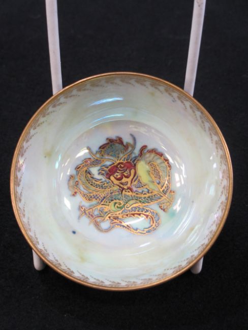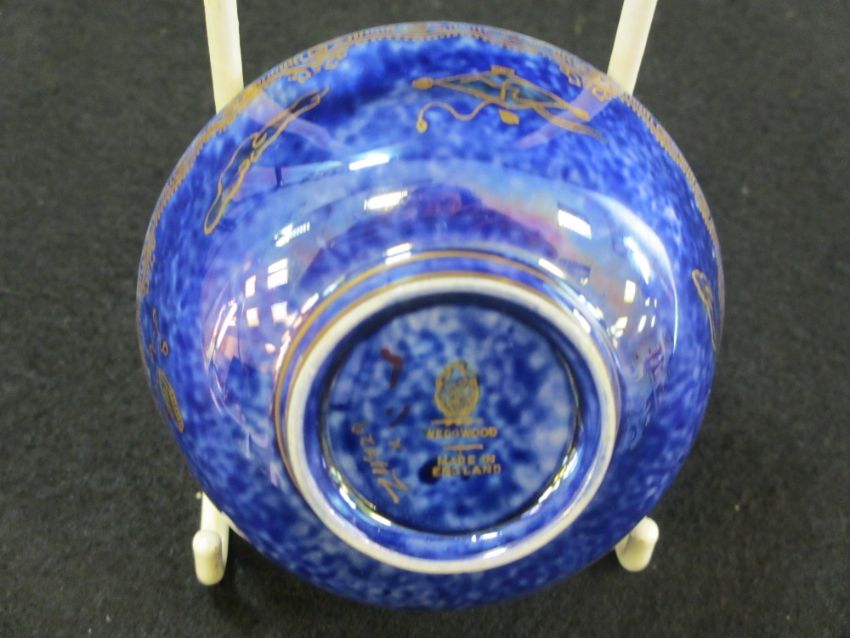 WEDGWOOD LUSTRE Z4829 CIRCULAR BOWL, dragon decorated to the interior against a pearl ground, mottled blue with gilt highlighting to the exterior, printed factory marks to the base, 3.5cms H, 8cms diameter