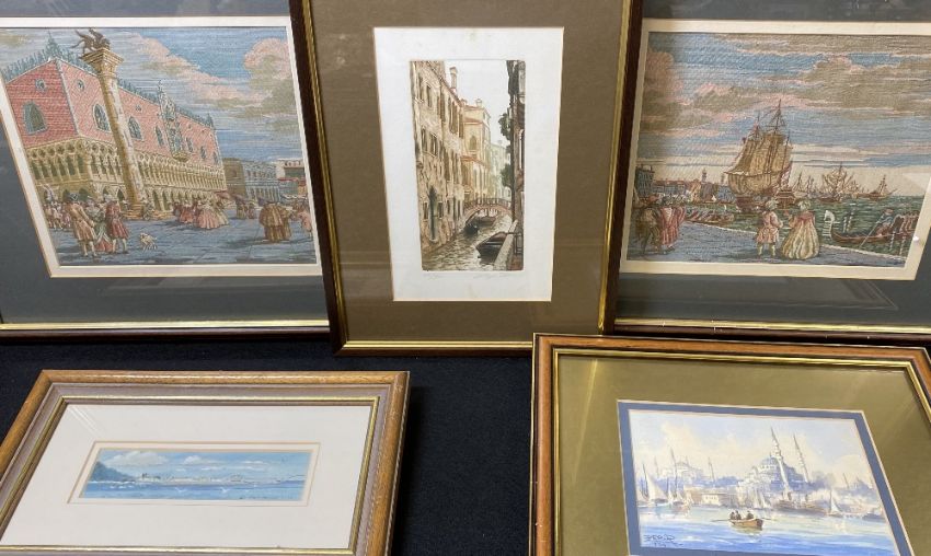 E ERIP watercolour - continental harbour scene with rowing boat to the foreground, 12.5 x 19 cms. Also, PAUL DAVIES watercolour, a pair of framed tapestries, ETC