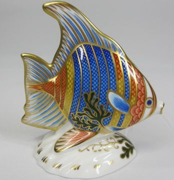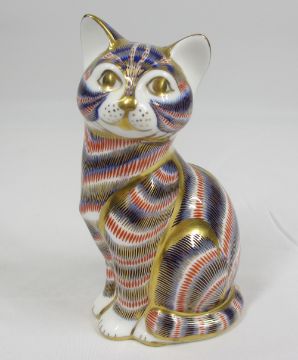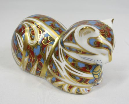 ROYAL CROWN DERBY PAPERWEIGHTS (4) - with gold stoppers, a dolphin, fish (with certificate) and two cats, 13cms tall