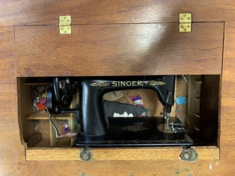 SINGER SEWING MACHINE TEAK FOLDING WORKSTATION with hand crank interior machine and a walnut cased portable example, 82cms H, 69cms W, 47cms D the work station closed