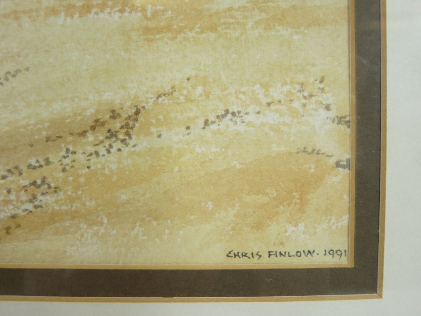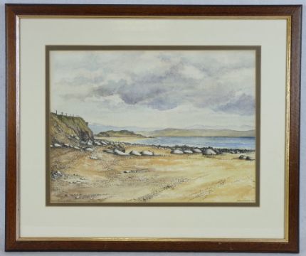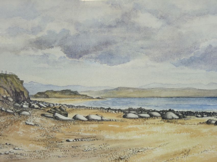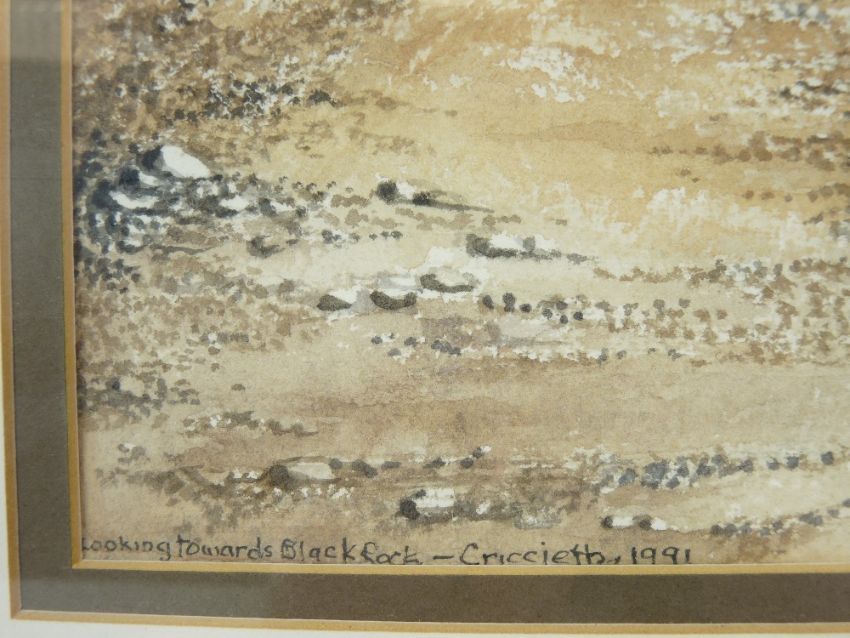 W AYRE oil believed on board - river scene with beached boats etc, signed, 37 x 54cms, MANNER OF DAVID COX JR watercolour - mountain scene with figure on a rock, 22 x 34cms and CHRIS FINLOW fine watercolour - beach and coastal scene with fence on cliff and hills to background, titled '200 King towards Black Rock' - Criccieth 1991, 30 x 40.5cms