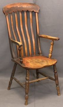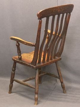 VICTORIAN FARMHOUSE ARMCHAIR - with shaped ribs to the back on turned arm and under tier supports, 107cms H, 51cms W, 39cms seat D