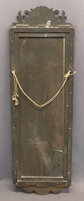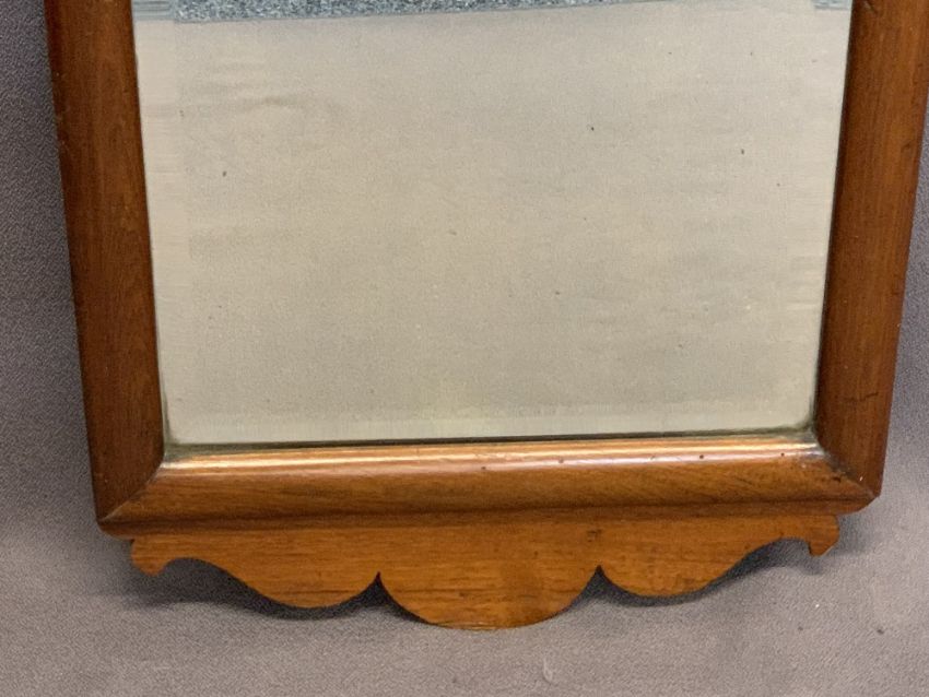 VICTORIAN MAHOGANY WALL MIRROR with shaped crest and apron detail, the mirror bevel edged, 118cms H, 37cms W