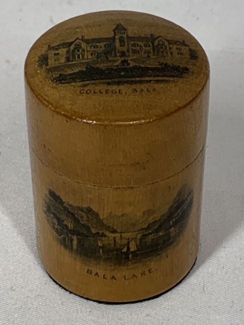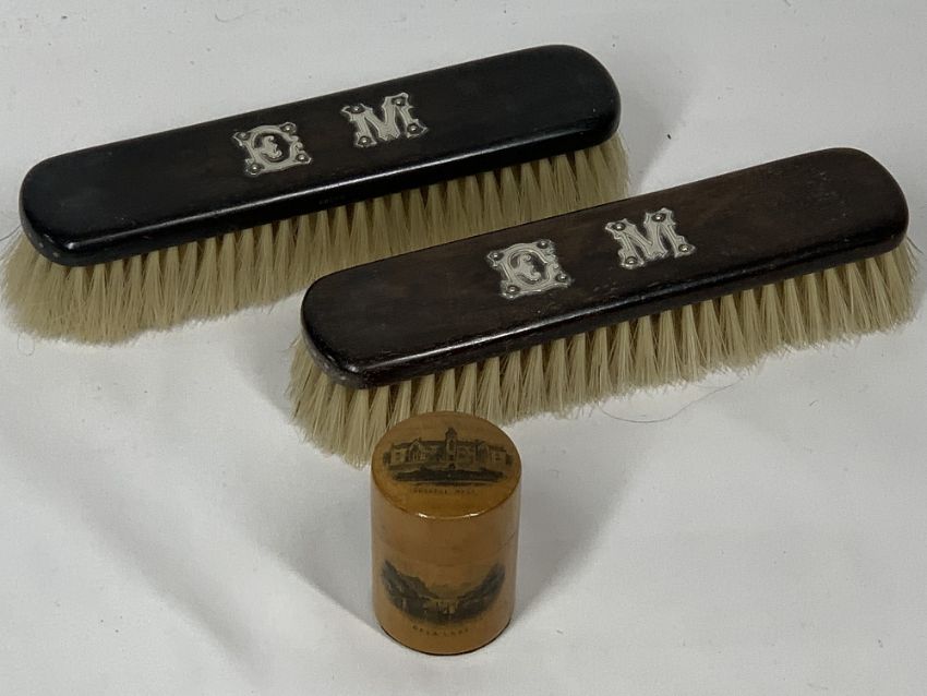 BALA MAUCHLINE WARE CYLINDRICAL BOX & COVER and two white metal initial mounted hardwood clothes brushes, the box depicting scenes titled 'College Bala' and 'Bala Lake', 4.5cms H, the brushes 15cms across